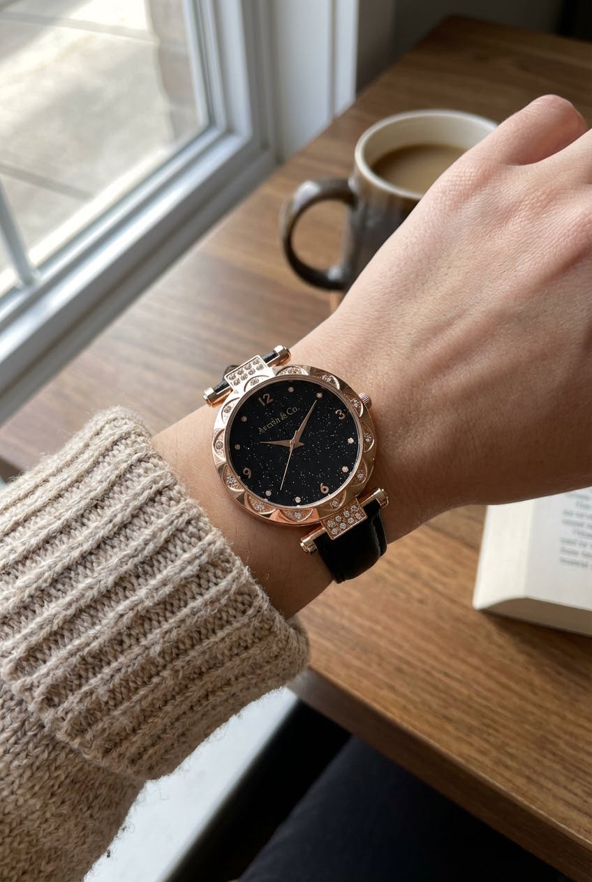 - Rose-gold accents and crystals add a luxurious sparkle to every movement.